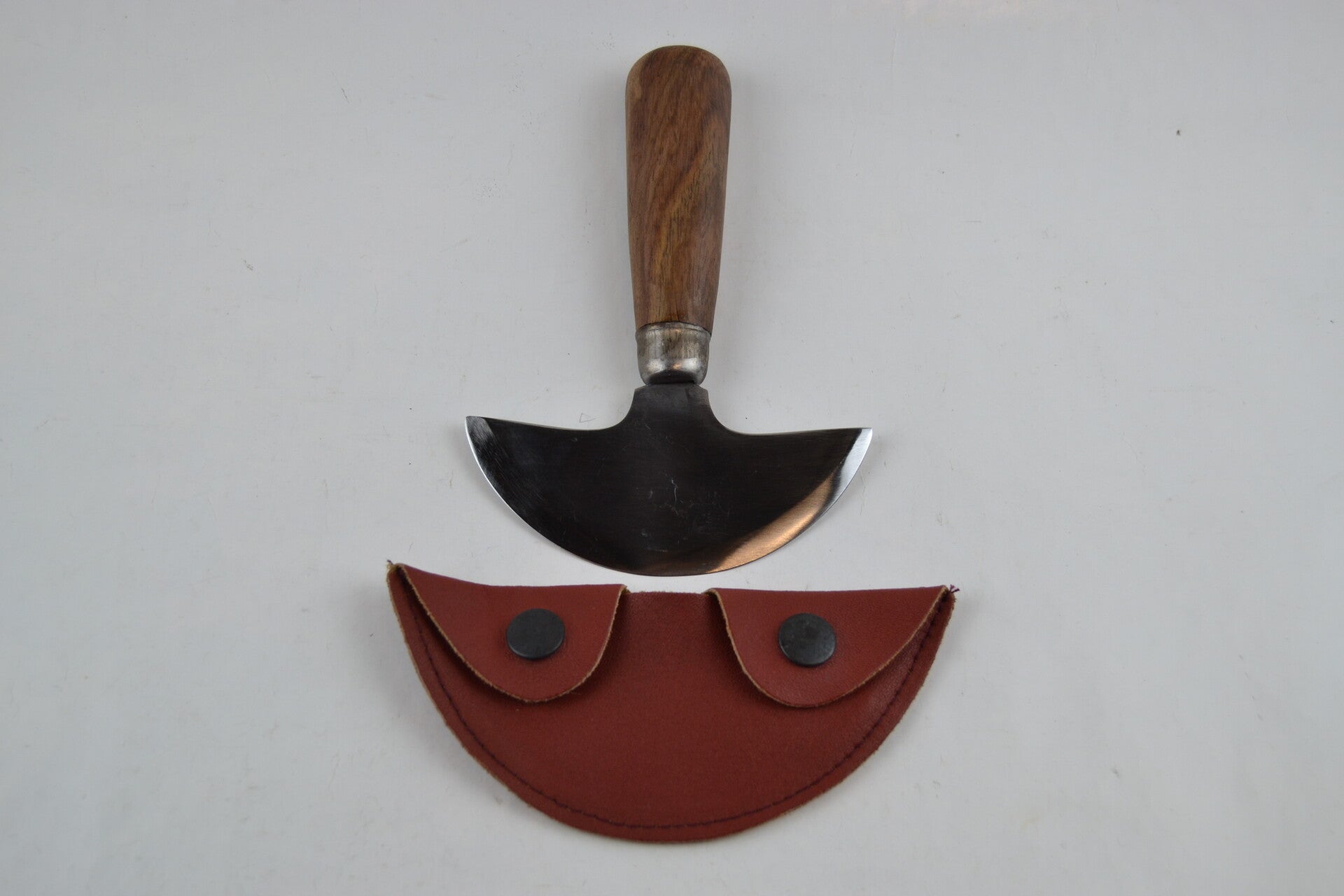 Sattlermesser aus Edelstahl Halbmondmesser mit Holzgriff und Leder Schutztasche